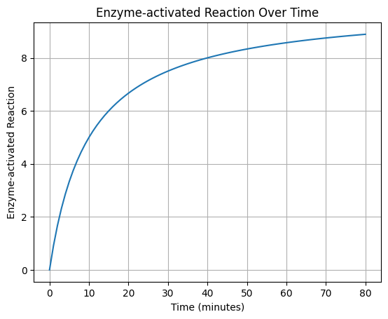 이번 예제코드는 효소 활성화 반응을 산출하는 파이썬 코드이다. Matplotlib, for loop, array을 사용하고 있기에 해당 functions들에 대한 복습을 하는데 괜찮은 코드이다. for loop과 array를 통해서 시간대별 변화하는 효소 반응을 산출하고 있으며, 산출된 결과값들을 기반으로 배열에 저장된 데이터를 그래프로 표현할 때에 matplotlib을 사용하고 있는 걸 확인할 수 있다.