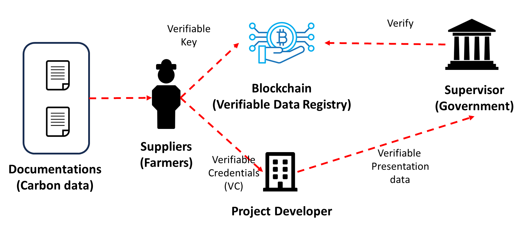 최근 글로벌하게 대두되고 있는 탄소 중립과 탄소 시장의 경우 데이터 투명성에 대한 Bottleneck (병목현상)을 겪고 있다. 탄소 중립을 위해서 CCUS와 같은 새로운 방향성의 탄소 절감이 이루어지고 이를 기반으로 한 탄소 시장이 활성화되고 있음에도 탄소 시장의 거래 방식은 이전과 동일한 형태로 유지되고 있다. 현실적인 비용절감과 데이터 투명성, Greenwashing과 같은 문제점들을 해결하기 위해서는 데이터 송수신에 대한 기술적 방식의 전환이 필요하다고 보이며 대표적으로 Blockchain 기반 DID가 이러한 문제점을 해소하는데 도움이 될 것을 본다. 아래의 그림은 글쓴이의 연구와 프로토타입을 간단하게 나타낸 다이어그램이기에 DID에 대한 프로세스를 이해하는데 도움이 될 것이다.