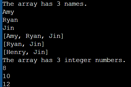 또한 ArrayList에 정수(Integers) 타입의 8, 10, 12의 세 개의 숫자를 추가해줬다. NameList와 마찬가지로 intList의 크기를 출력하고 요소를 통해 반복하여 표시하는 걸 확인할 수 있다. 결과적으로 이번 포스트를 통해서 Elements 추가, 제거 및 업데이트를 포함하여 ArrayLists를 선언하고 초기화하고 조작하는 방법을 복습해 볼 수 있다.